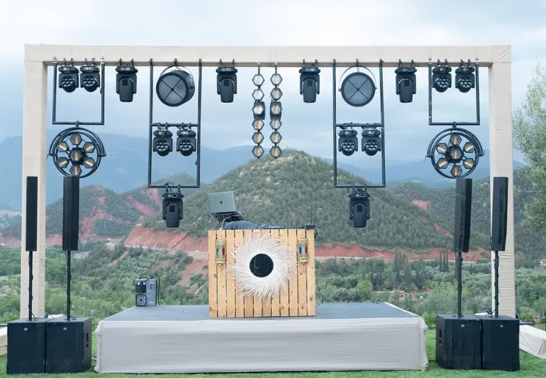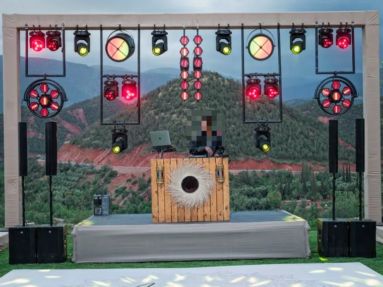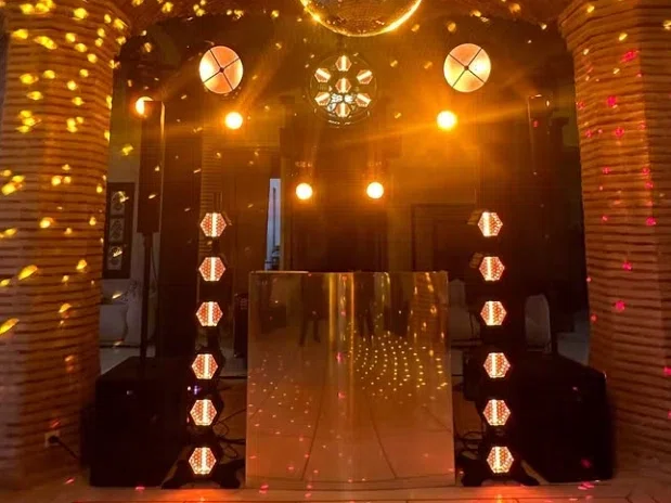 About a month after delivery, he sent us photos from one of his events — a vintage-themed wedding stage. The warm amber glow from the lights perfectly matched the wooden stage décor and the live band setup. The whole scene looked like a classic concert from decades ago.